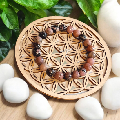 La rhodonite équilibre les énergies et les émotions. Elle incite à la douceur, au respect et à la tolérance. Elle est favorable au pardon et à l'indulgence. Elle est reconnue pour aider à attirer l'amour. Elle abaisse le niveau de stress et d'anxiété. Elle incite à la valorisation et l'estime de soi. Elle aide à supporter les moments difficiles. La rhodonite réconforte et soulage des blessures du passé. Elle aide à libérer toute la colère enfouie.