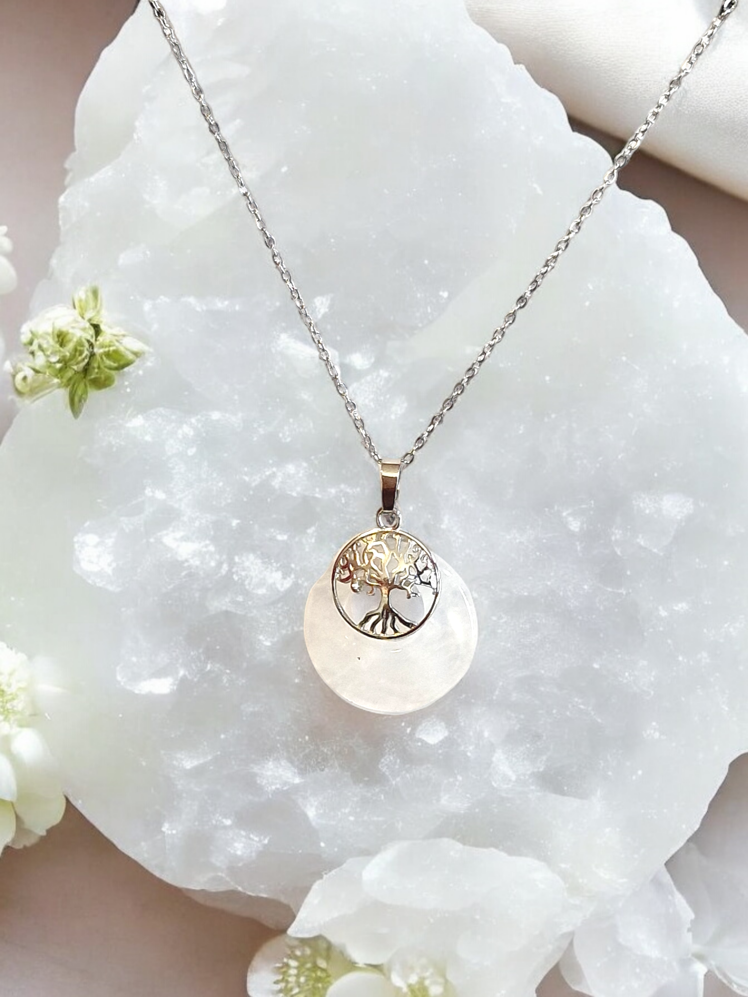 Pendentif cristal de roche arbre de vie médaille + chaine en acier inoxydable