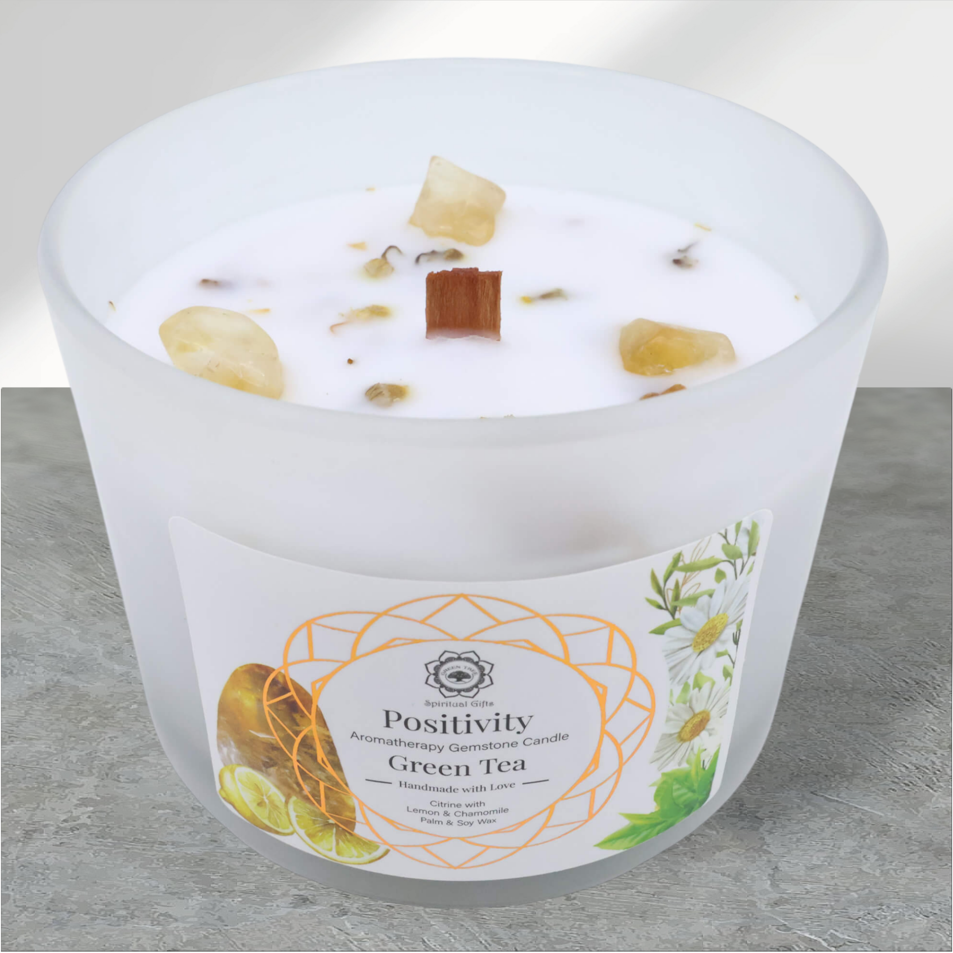 Cette bougie est spécialement conçue pour vous envelopper de douces vibrations positives. La citrine, pierre de la joie et de la prospérité, se marie délicatement avec le thé vert, symbole de vitalité et sérénité.