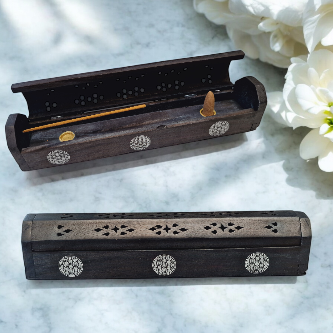 Support encens en bois, boite 30cm fleur de vie