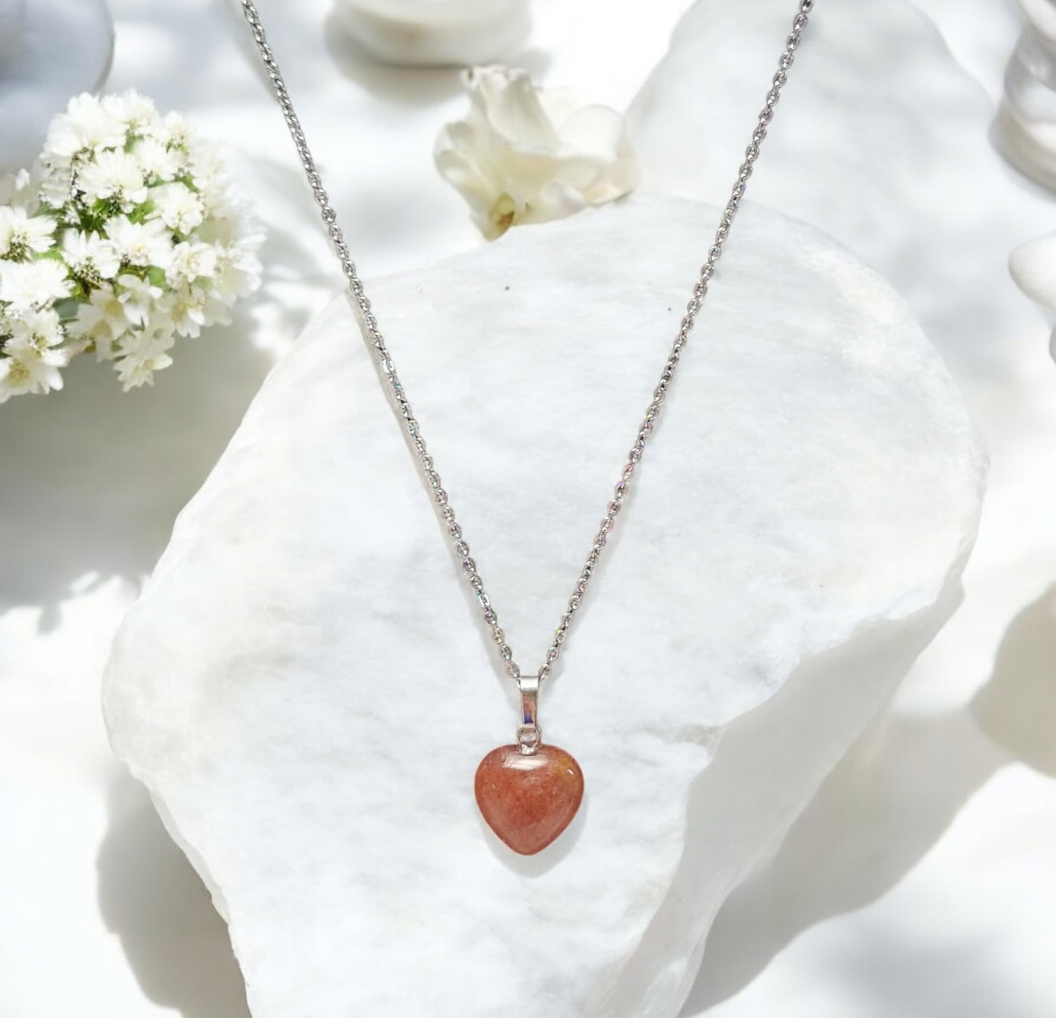 Pendentif coeur 15mm quartz fraise A+ + chaine en acier inoxydable