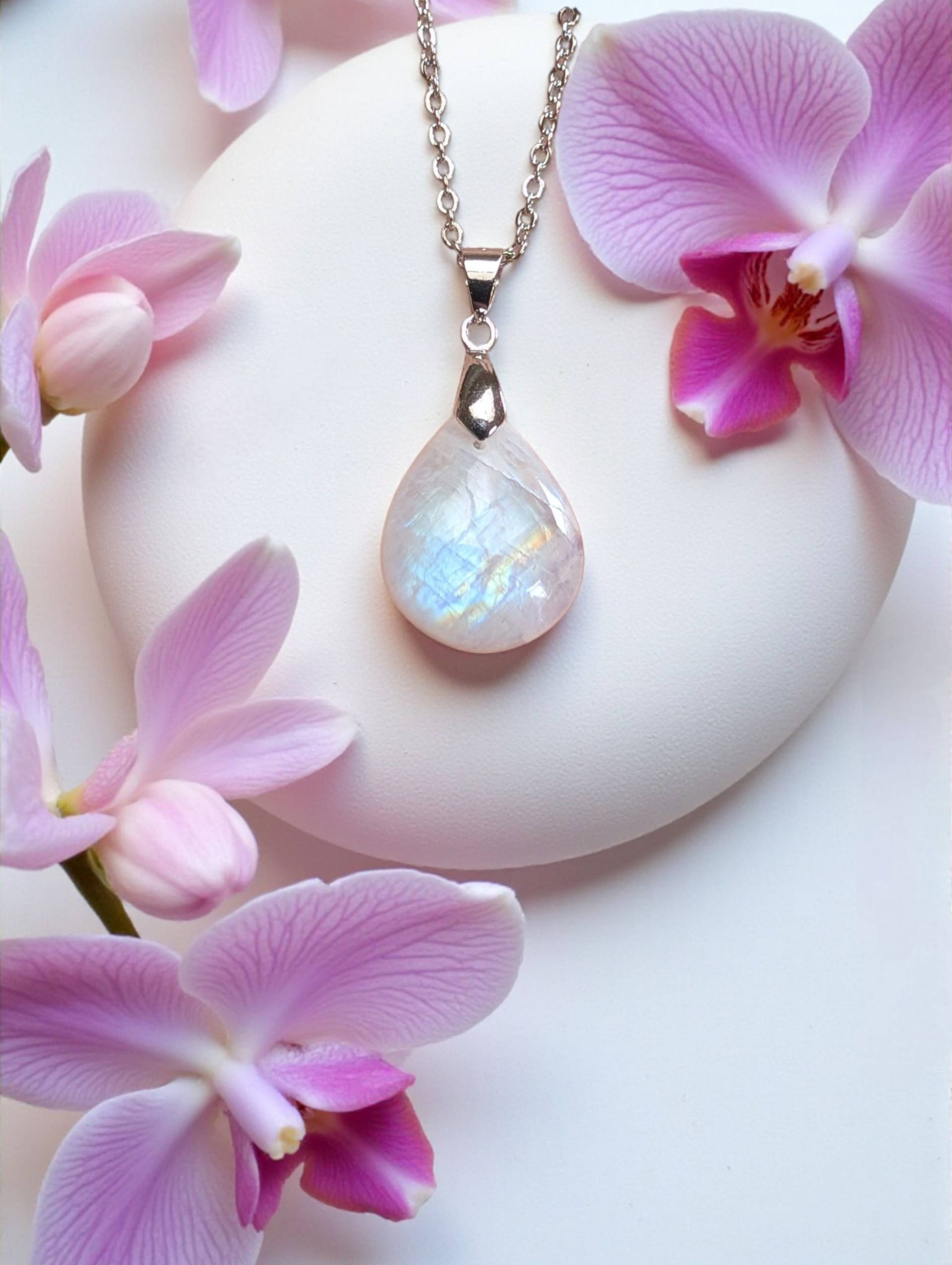Pendentif en pierre de lune AA (environ 2,5/3cm) sur chaîne en acier inoxydable.